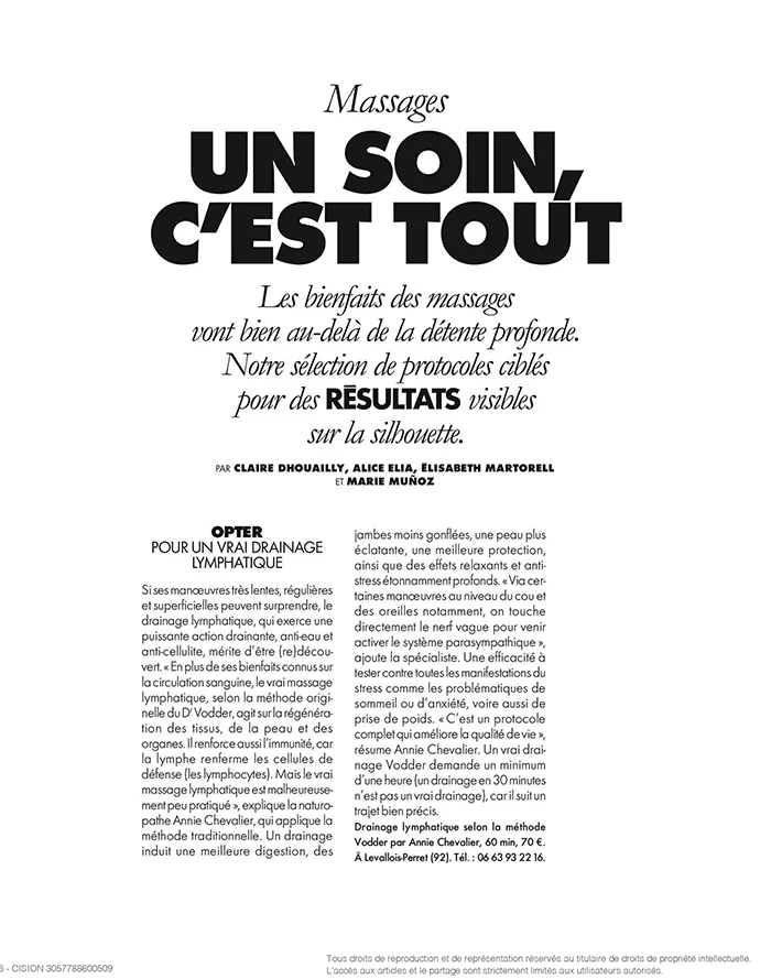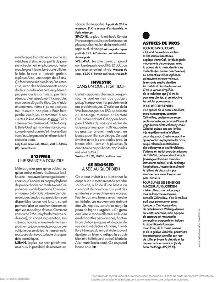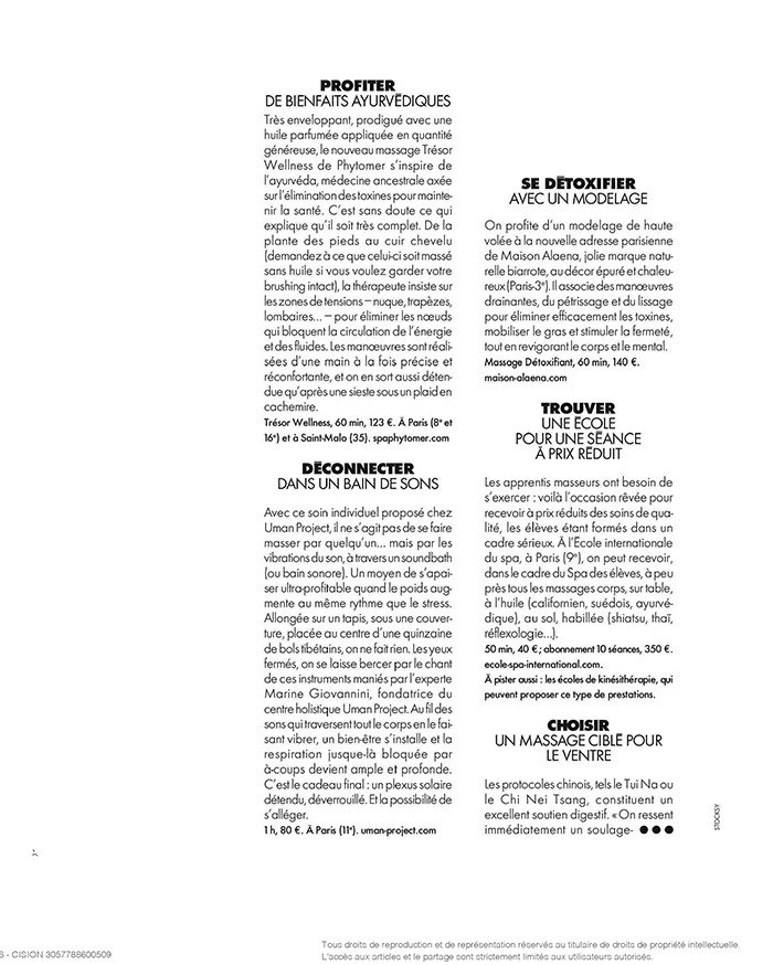 Les protocoles chinois, tels le Tui Na ou le Chi Nei Tsang, constituent un excellent soutien digestif. « On ressent immédiatement un soulagement lorsque la praticienne touche les méridiens et stimule des points de pression directement en phase avec l’estomac, le gros intestin, la vésicule biliaire, le foie, la rate et l’intestin grêle », explique Aline, une adepte de 48 ans. Ça fonctionne très bien lorsqu’on est en crise, avec des ballonnements et des douleurs :«Je fais des cures régulières à peu près tous les six mois. La première séance, c’est absolument incroyable, mon ventre dégonfle illico. Ça m’aide énormément, même si ça ne peut pas tout résoudre non plus. » Pour faire perdre quelques centimètres à ses clientes, la kinésithérapeute Anne Cali a créé un protocole issu du Chi Nei Tsang, le Belly Gad, qui inclut des manœuvres complémentaires afin d’éliminer la rétention d’eau, le gras, et d’améliorer la tonicité de la peau. Belly Gad, Anne Cali, 60 min, 200 €. À Paris (8e). annecali.com