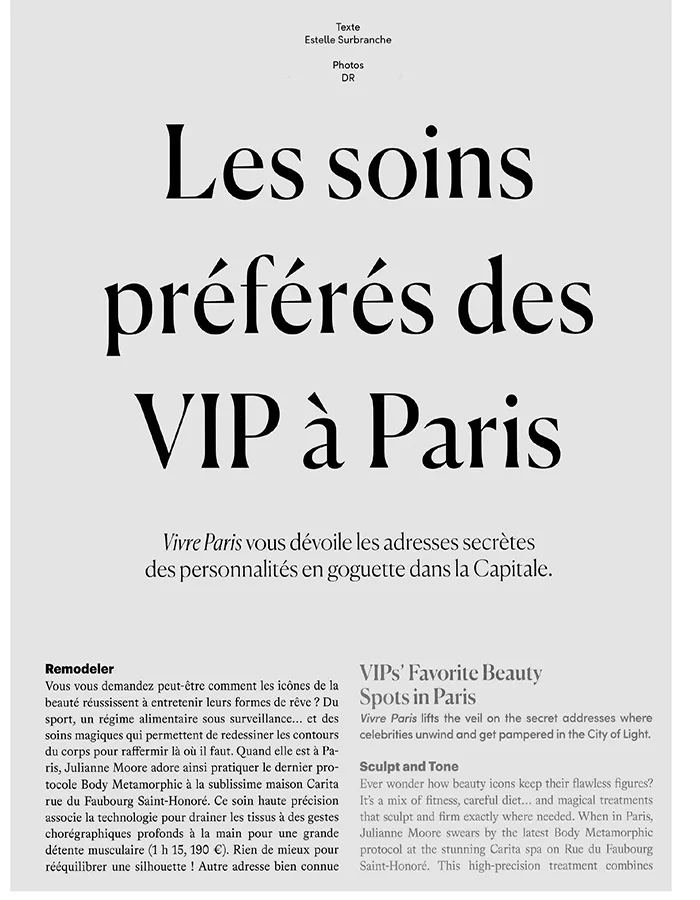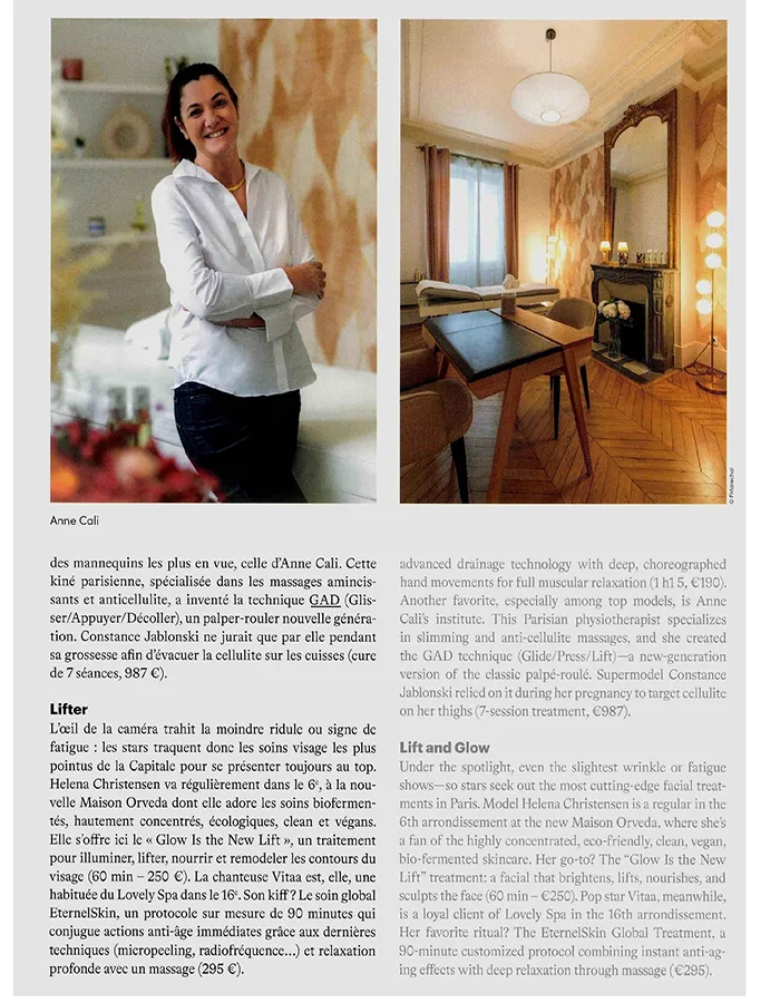 Another favorite, especially among top models, is Anne Cali’s institute. This Parisian physiotherapist specializes in slimming and anti-cellulite massages, and she created the GAD technique (Glide/Press/Lift)— a new-generation version of the classic palpé-roulé. Supermodel Constance Jablonski relied on it during her pregnancy to target cellulite on her thighs (7-session treatment, €987).